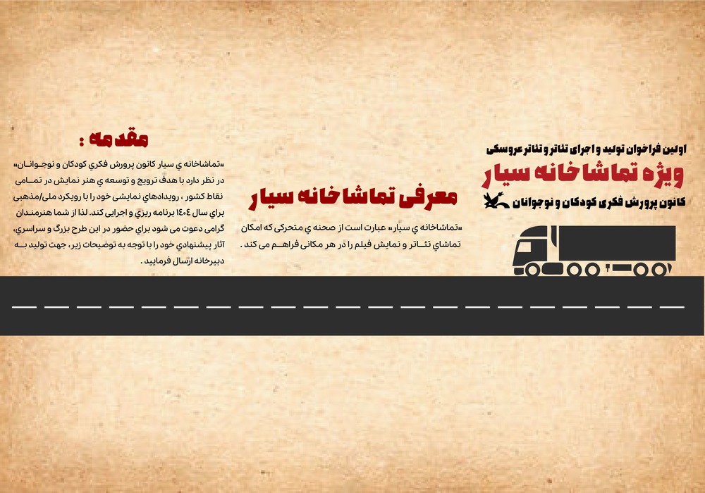 نخستین فراخوان تولید تئاتر و تئاتر عروسکی ویژه تماشاخانه‌ی سیار کانون پرورش فکری کودکان و نوجوانان‌ با هدف ترویج و توسعه‌ی هنر نمایش منتشر شد.